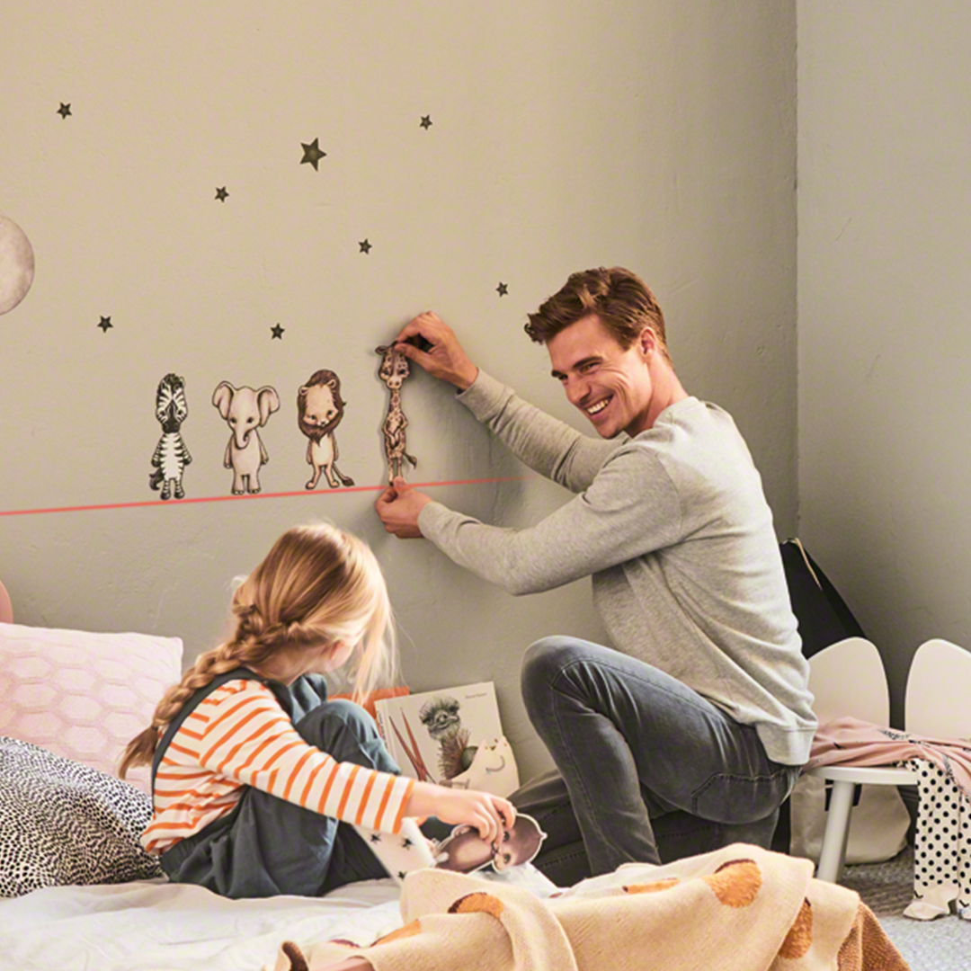 For example to adjust pictures, shelves and coat hooks or for a perfect alignment of creative wall designs (e.g. wall tattoos)